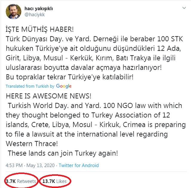 Ο Χατζί Γιακισικλί (Hacı Yakışıklı), που εργάζεται για το Akit TV, αναφερόμενος στις τουρκικές ΜΚΟ που διατείνονται να διεκδικήσουν σε διεθνή δικαστήρια για λογαριασμό της Τουρκίας ελληνικά και αραβικά εδάφη, έγραψε σε μια έξαρση εξαλλοσύνης:
